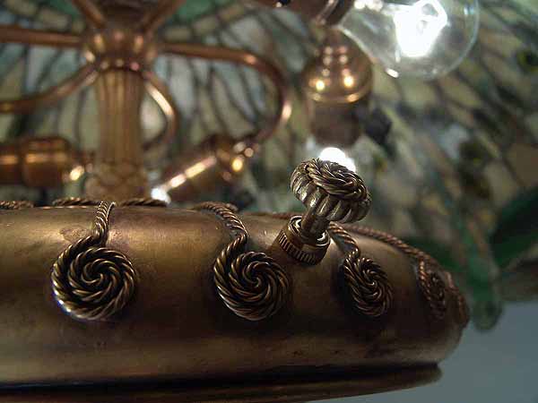 This base is gold plated by hand. It is wired according to new US safety standards. It comes with old style cloth covered lamp cord and six antique standard sized general electric turnkey lamp sockets.
